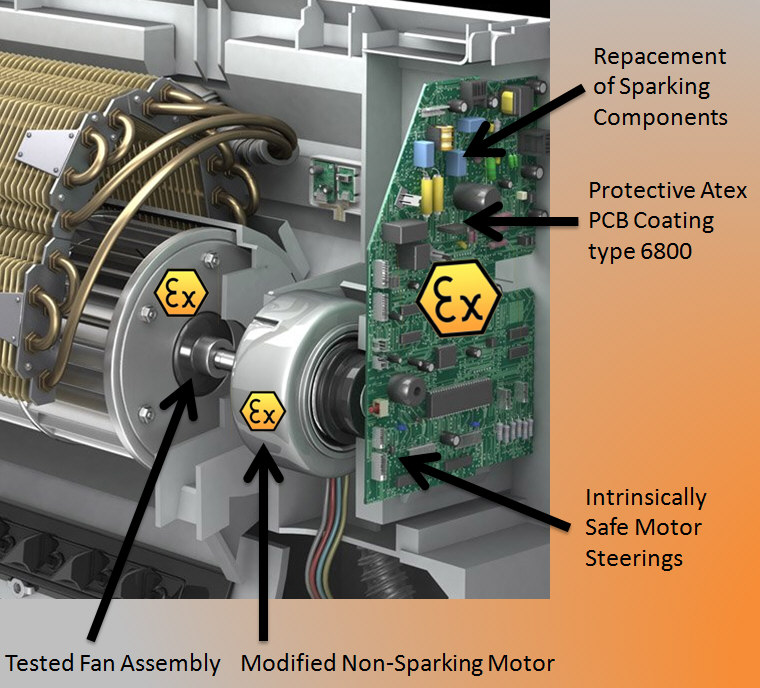 Picture 1 demonstrates some of the protective anti-explosion measures intergrated in Atexxo’s indoor unit. All modifications are according to safety standards, well documented and tested. Standard units are available from Daikin, other brands can be delivered on request.